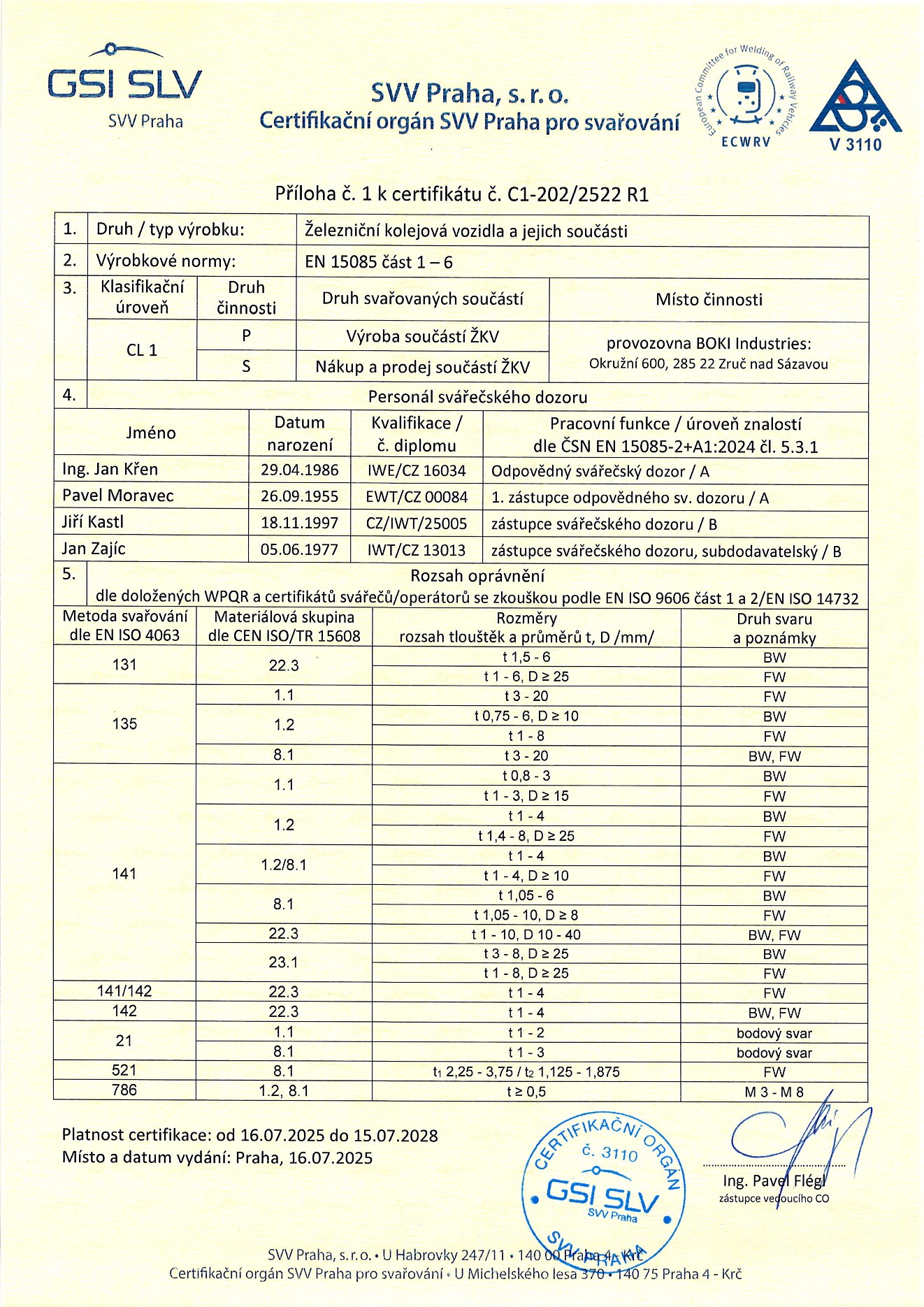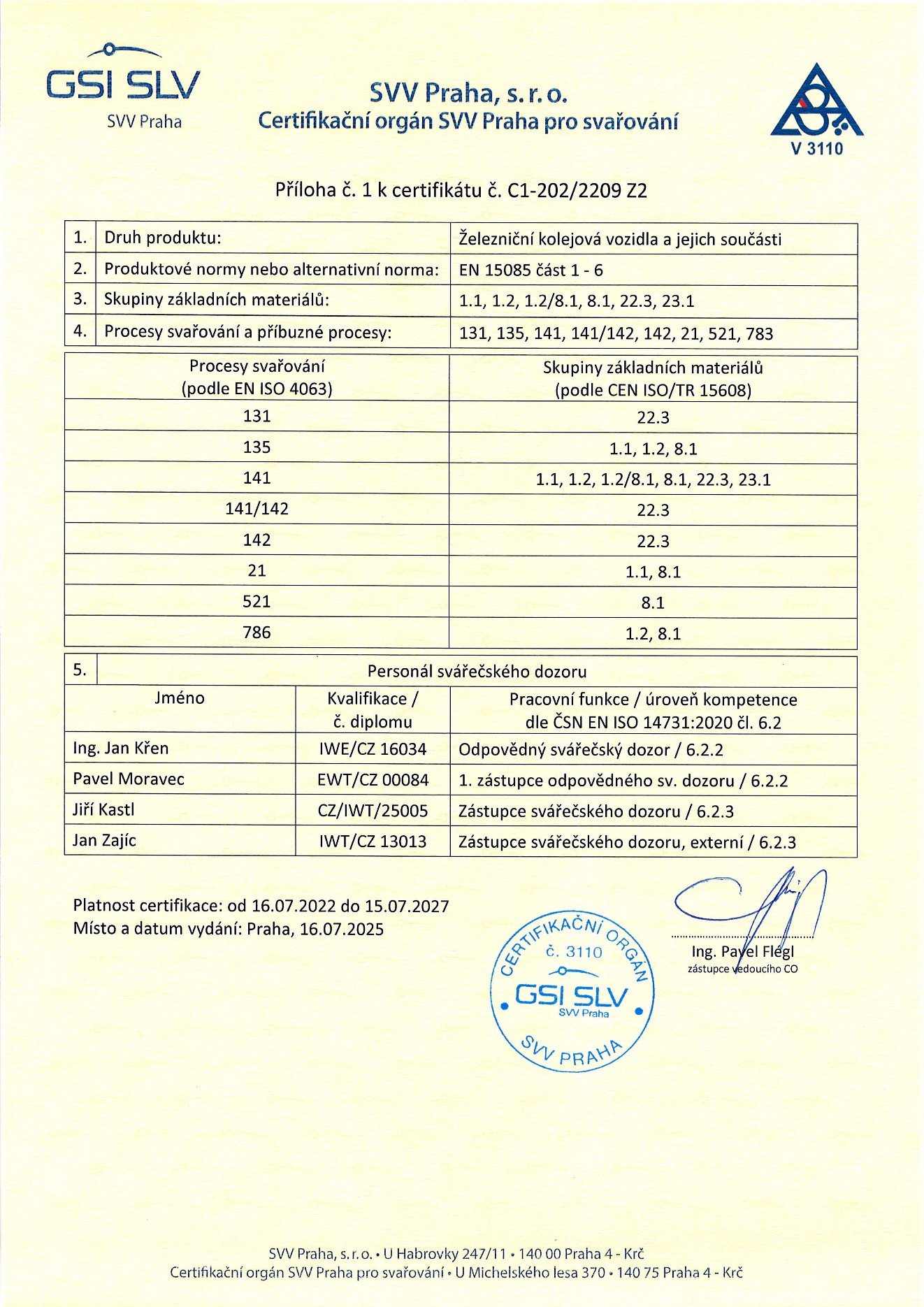 Proces svařování je certifikován dle ČSN EN ISO 3834-2:2022 ve spojení s ČSN EN ISO 14554-1:2014, včetně certifikace pro svařování železničních kolejových vozidel a jejich částí dle ČSN EN 15085-2+A1:2024 ve shodě s předpisem ČD V95/5 v platném znění.