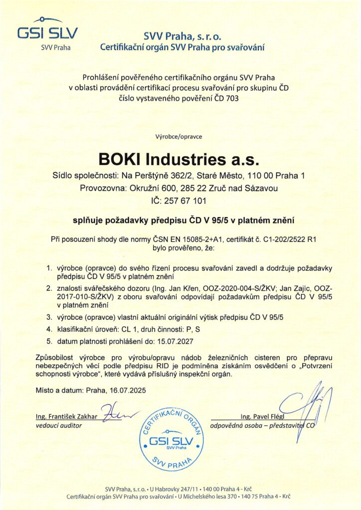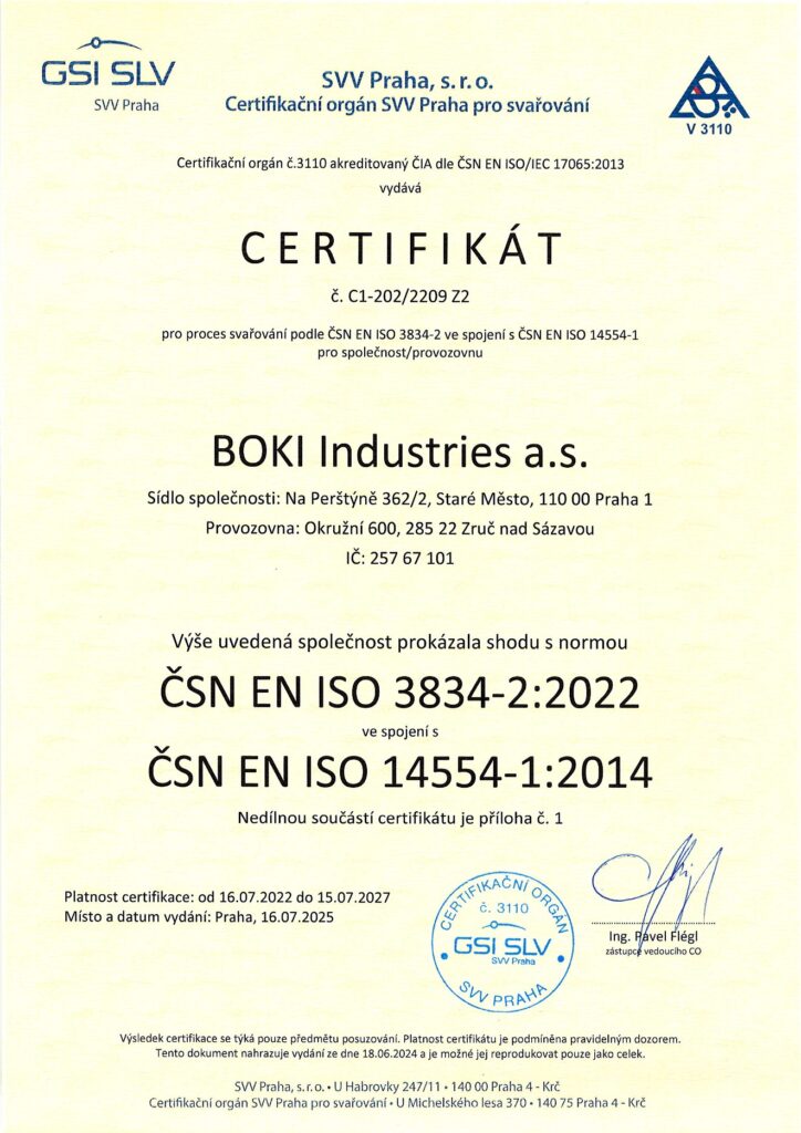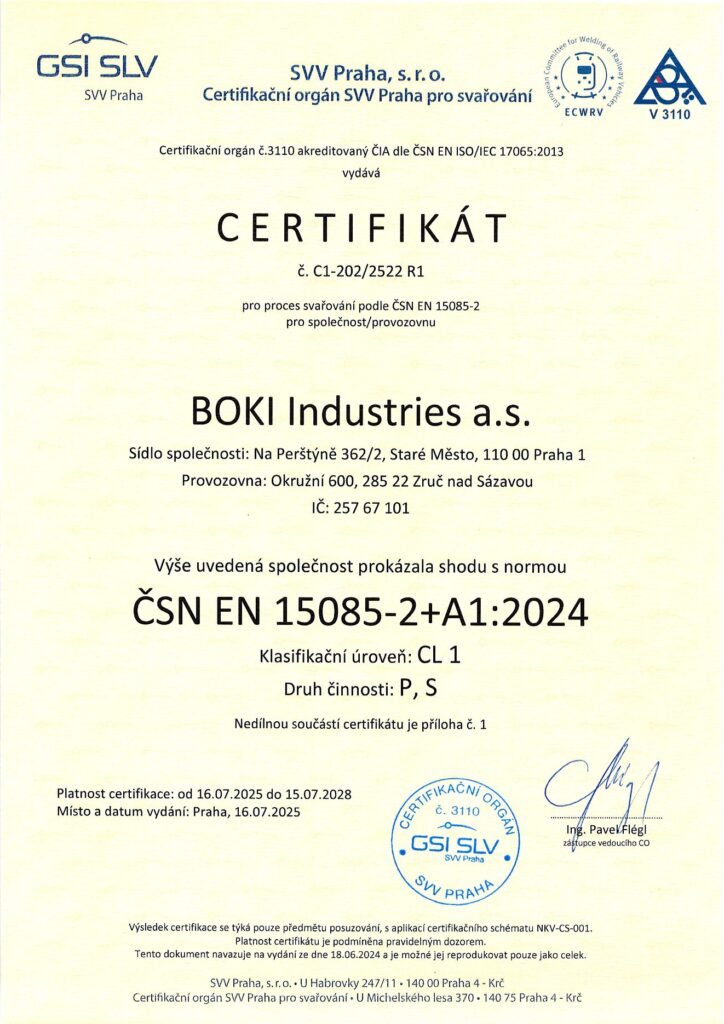 Proces svařování je certifikován dle ČSN EN ISO 3834-2:2022 ve spojení s ČSN EN ISO 14554-1:2014, včetně certifikace pro svařování železničních kolejových vozidel a jejich částí dle ČSN EN 15085-2+A1:2024 ve shodě s předpisem ČD V95/5 v platném znění.