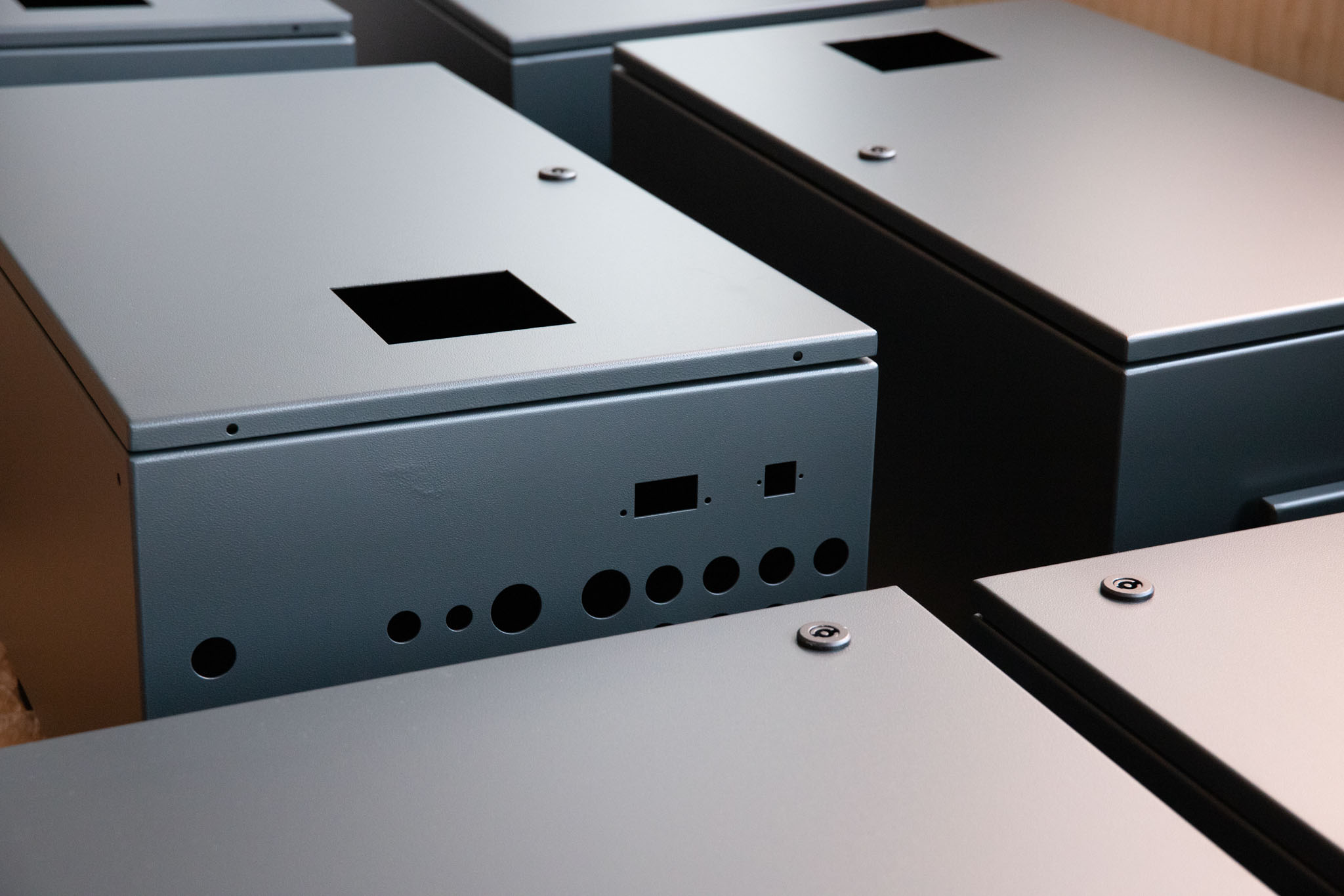 Schaltschränke sind unser typisches Produkt. Jährlich fertigen wir davon mehrere Tausend Stück in Dutzenden Ausführungen mit bestückten Türbändern, Schlössern, Dichtungen und auf Kundenwunsch auch mit der grundlegenden Verkabelung. Außer traditionellen Stahlschränken können wir ebenso Edelstahl- oder Aluminiumausführungen für Spezialanwendungen anbieten.