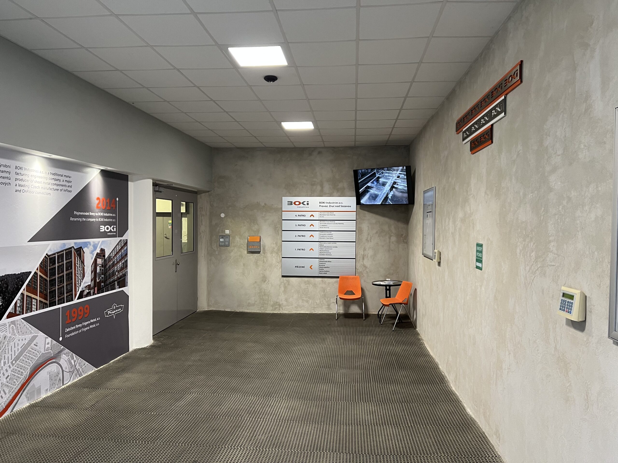 Dalším výrazným prvkem prostoru se stala orientační tabule, kterou doplňují dvě vitríny a televize, která vysílá krátká videa z výroby a různá jiná sdělení jak pro zaměstnance, tak pro návštěvy.